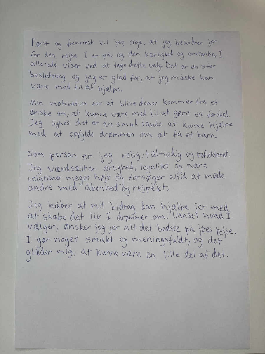 Der Spender dachte erstmals vor zwei Jahren darüber nach, zu spenden, als er sein Sperma testen ließ. Er erkannte, dass er Spender sein könnte, fand die Idee interessant, entschied sich jedoch erst vor Kurzem dazu, als der Gedanke durch eine Werbung wieder in ihm aufkam. Er sieht es als Privileg, selbst Kinder bekommen zu können, während andere dieses Glück nicht haben. Dies weckte in ihm den Wunsch, anderen zu helfen, diesen Traum zu verwirklichen. In dieser Entscheidung wird er von seinen engen Beziehungen unterstützt.