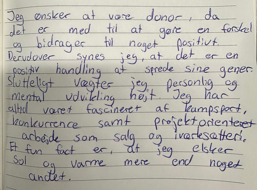 Er sieht darin eine Möglichkeit, etwas Gutes zu tun und seine Gene weiterzugeben. Er sprach mit einem Freund über die Möglichkeit der Samenspende, und sie bewarben sich gemeinsam – letztlich war jedoch nur er erfolgreich im Auswahlprozess. Auch wenn er persönlich niemanden kennt, der Schwierigkeiten mit der Empfängnis hatte, betrachtet er die Spende als gesellschaftlichen Nutzen.